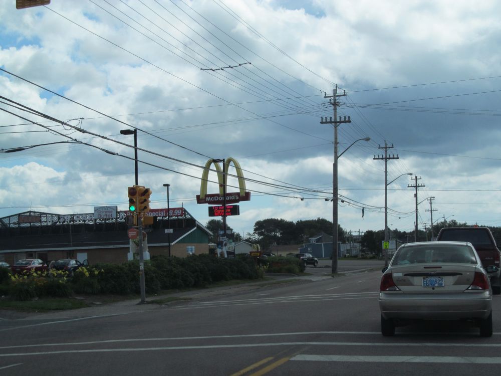 这是我们整个行程中唯一一次看到大型的野生动物(老鼠乌鸦不算),这也让我们兴奋了好久。可惜始终没有看到驼鹿,似乎有点没到长城不是好汉的感觉,始终有点耿耿于怀。 天气越来越好,就在要离开CAPE BRETON之前,即将从105国道到104国道出准备上坎索大堤时,JOHN开错了路口,又开回去了。努力寻找的时侯,发现了一家麦当劳!正好是中午,肚子也饿了,先吃吧。更重要的是,我们从进海洋三省时就想着的McLOBSTER,终于在这里得以实现。
