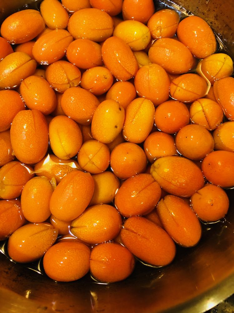 水收的超不多了,把金橘放烤盘,220F,烤到半干: