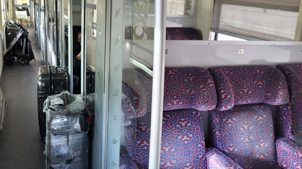 车站只有两个候车室,都很小,所以多数人都在大厅逗留,开车十分钟前才直接去站台。摩洛哥的旅客列车很有特点,无论一等车厢还是二等厢,车厢都分成十分隔间,类似中国过去火车中的软座。每个隔间左右相向两排座位,一等和二等的差别不大,前者每排3个座位,而后者4个。座位的编号与隔间位置有关,第一个隔间是11到16,而下一隔间则是21到26。我们的隔间没坐满,我们这边只我俩,对面是当地高中的两个女孩,趁周末去马拉喀什玩耍。