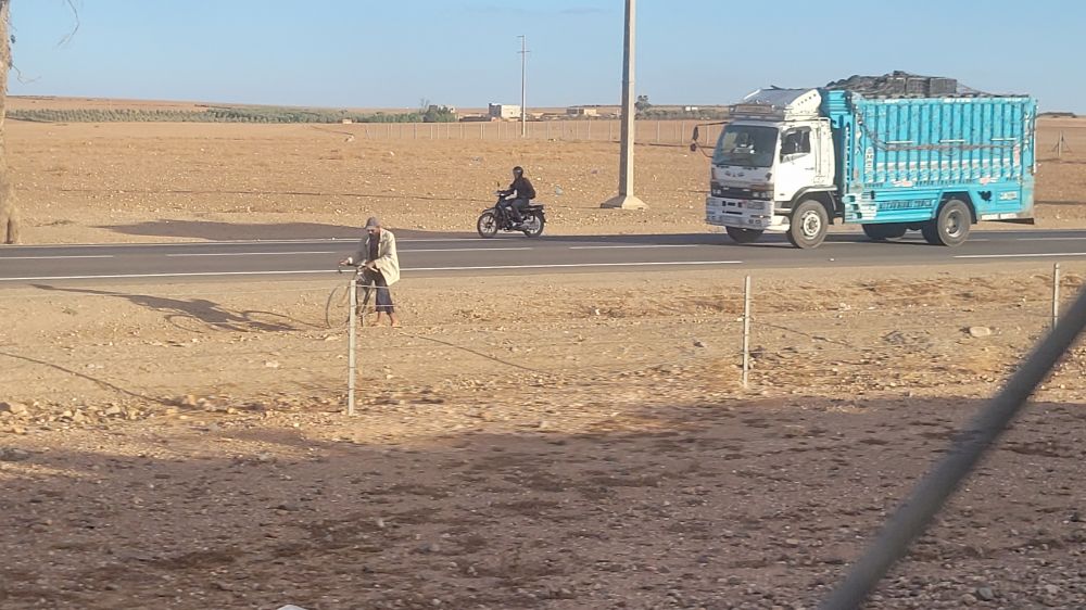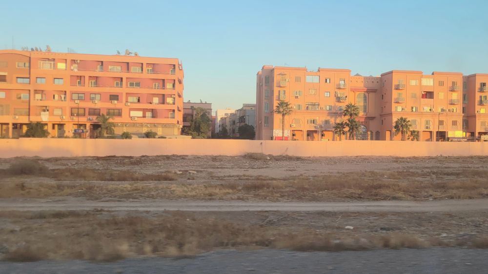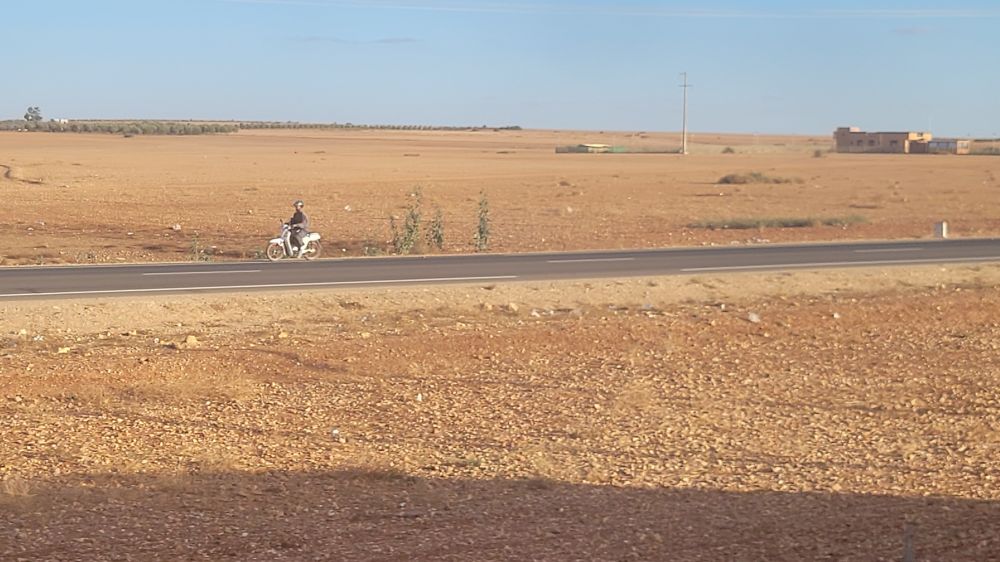 列车运行了大约3小时之后,窗外的地势又变得平坦,也出现了柏油公路。公路上的汽车不多,其它的车子也不多,偶尔有骑自行车或者摩托的,总之公路使用率不是很高。后来火车接近马拉喀什,外面出现了高高低低的楼房,外墙也是各种色度的红色,看来马拉喀什”红城”的名号不是虚传的。