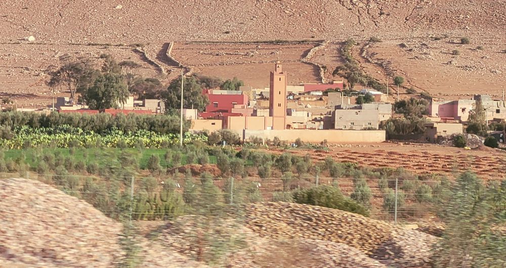 列车开头几十分钟基本上是原路返回,最先一站就是城南那个站,当即明白之前有何不少人在此下车了。他们没去市中心至少节约了十多分钟,而城里开来的火车又有十来分钟,所以有时间赶上中午12点过那班,而我们去城里多了一段时间,只能赶上下午1点过那班。列车路过机场不久,在一个小站停车时上来不少人, 大箱小箱像是机场那边过来的。当时明白这效该是机场去马拉喀什最快的途径,先打车到这个车站,再乘车去马城,时间差不多要少两个小时,车费也省不少。