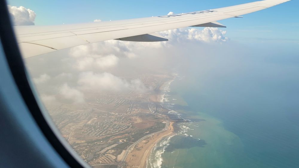 去摩洛哥,最初我们考虑乘加航先飞伦敦,然后再转卡萨布兰卡,但邻居朋友说他们乘坐的是摩洛哥航空直飞卡萨,服务也不比加航差,于是我们也选择了摩航。飞机是多伦多晚上10点过起飞,全程七个多小时,于次日当地时间上午10点45分到达卡萨布兰卡。卡萨是海港城市,当飞机飞临上空时一边是湛蓝的大西洋海面,一边是房屋多为白色因而有白城之称的卡萨布兰卡。那天是晴天,但下面的视野并不完全透明,而是有一层淡淡的黑雾,看来卡萨这座城市空气质量不是太好。