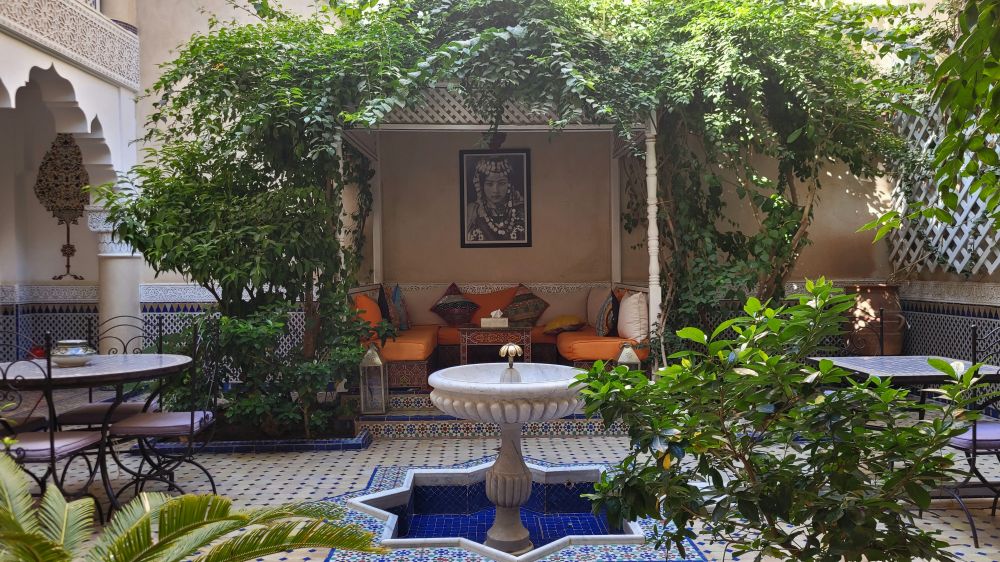 在马拉喀什的一个独特体验,就是庭院旅店 Riad hotels。故名思议,这种旅店有一个庭院,其中庭通天采光充足,四周楼上楼下则是客房。马拉喀什的老城 Medina 和新城都有庭院旅店,但老城的更有特点。这些庭院旅店深藏在老城的小街小巷里面,过去曾是大户人家的府第,现在改成了特色旅店。这些庭院相当于北京什刹海附近过去大户人家的四合院,每家都有其来历和荣耀。