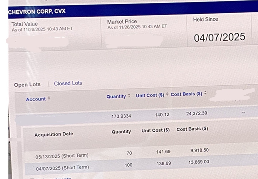 我在4/7/2025,5/13/2025两次买入170股Chevron(CVX)股票.我是这样分析的:各国都在狂印钞票,通膨很厉害.持有实物或实物的股票比较顺应时势,黄金疯长就是这个道理.