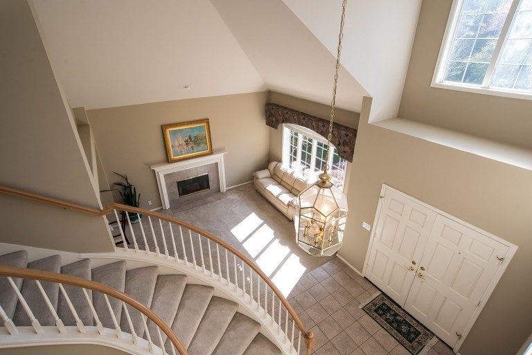 美国90年代的新房都是浅色(原色)厨柜与2到3英寸宽的地板,厨房台面积、花色瓷砖洗手间台面、金/铜色Hardware如门把手、Door Hange、门锁、door stopper、金色吊灯等等。Interior Door普遍使用6 Panel,门、窗边与地脚线都是2-3“的波浪型小trim。厚厚的 crown molding, 重装饰线条、皇冠线、淡黄色调墙面、部分墙纸点缀如Family room,Ding room 与 study/office room,弧形楼梯、花纹瓷砖深色石材壁炉,等等。那是一个追求 “看起来豪华” 的年代,线条越多越显档次。Living room,Ding room、Family room 分隔明显。美学落后、采光较暗。大厅木地板只是部分使用,其它都是地毯。当时木材便宜、人工便宜,线条工(trim carpenter)好找,因此装饰越多越能体现 “豪华感” 。甚至一些餐厅都是地毯,是现今翻修最常改造的部分。