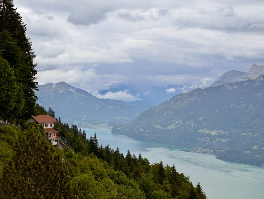 向左看是东面的因特拉肯市和布里恩茨湖;回头向右是西面的图恩湖。