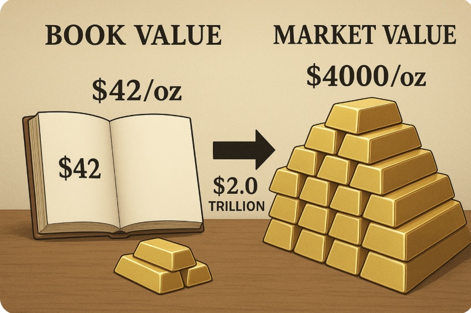 美国现在拥有的黄金账面上是$42/oz,跟市价$4000相差甚远。如果将其价格提升至市价,账面上会多出2万亿。这么好的事情,干嘛不去做?想想都觉得美!:)