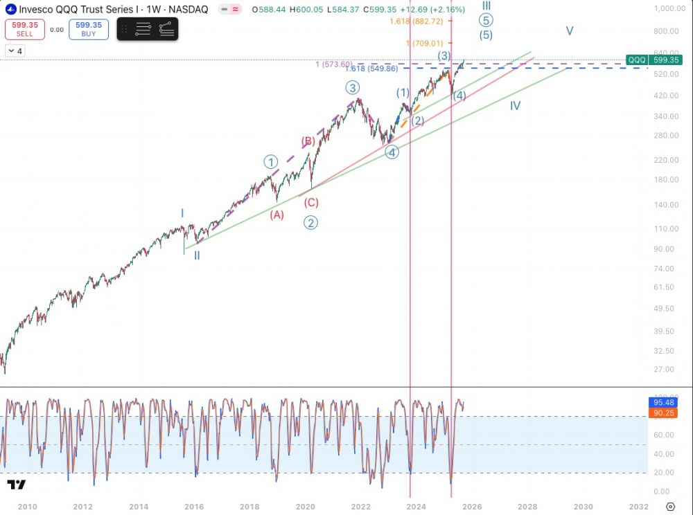 由于最近QQQ轻松越过585,primarydegreewave5是一个wave3extended的impulse的可能性已经很小,决定画一个新的labelgroup,更新了primarydegreewave5的subdivision,把wave2移到了一个Stochastic的显著低点.在周线图上,通常较高degree的correction都会把Stochastic打到20附近,所以这个labelgroup里的intermediatedegreewave2和wave4是符合要求的.有时lowerdegree的correctivewave似乎也可以把Stochastic带到很低的数值,甚至低于higherde...[