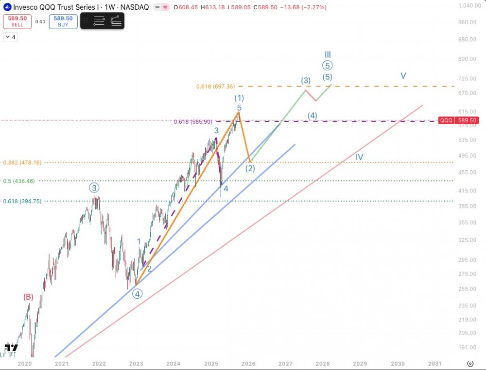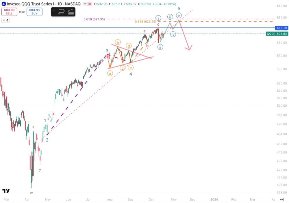 由于接下来如果会进入熊市的可能走法被invalidate的条件比较清楚,或者我们已经开始熊市,所以暂时不重新审视.我们可以根据牛市走法被invalidate的条件来协助判断是否熊市走法,反之亦然.之前判断,如果今年4月开始的impulse在610-620附近结束,wave2不retrace过深,理论上足以将QQQ带到710.目前这个impulse是在613结束,下面看看怎样的走法有可能将QQQ带到710.